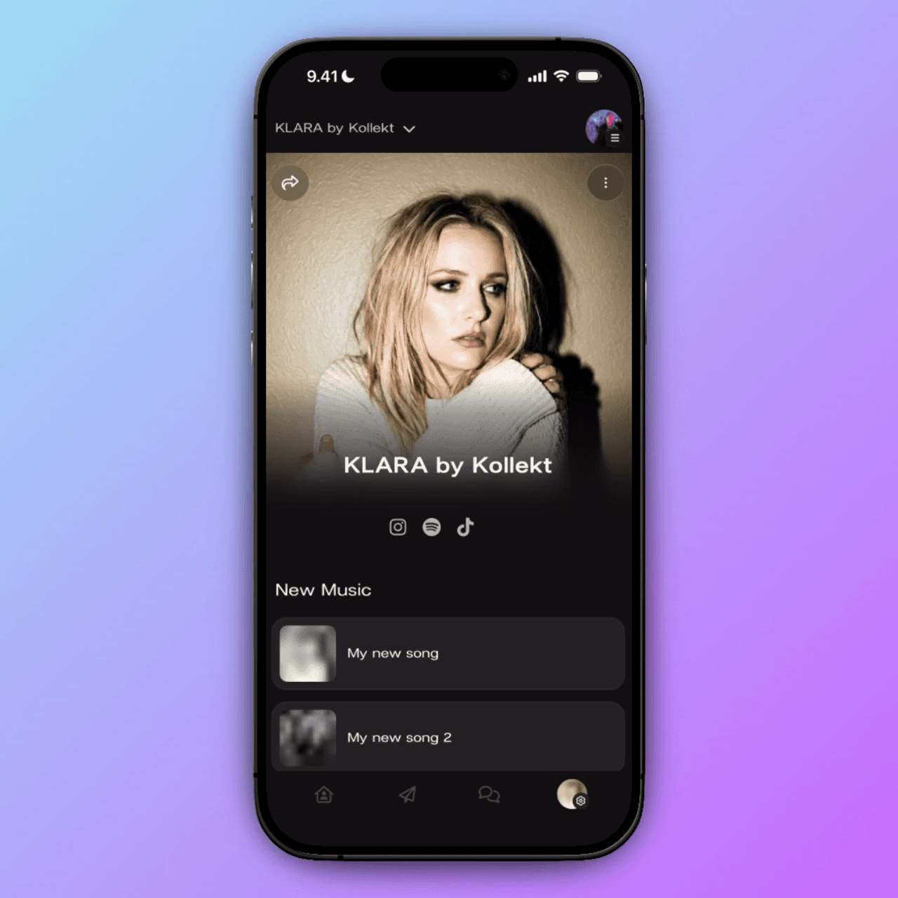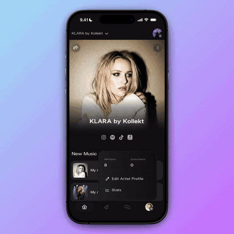 Tap the ‘+’ next to your social links to add Instagram, TikTok, Spotify, Apple Music, and more. Then add your latest releases in the New Music section — fans can listen straight from your profile without leaving Kollekt.