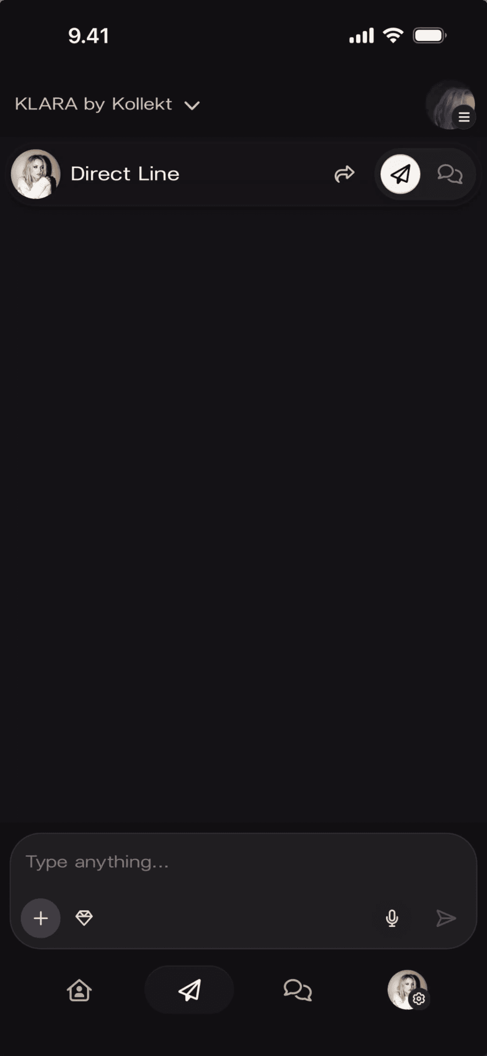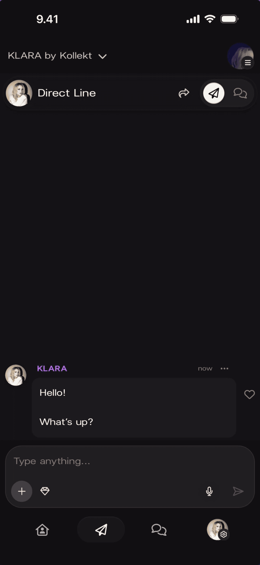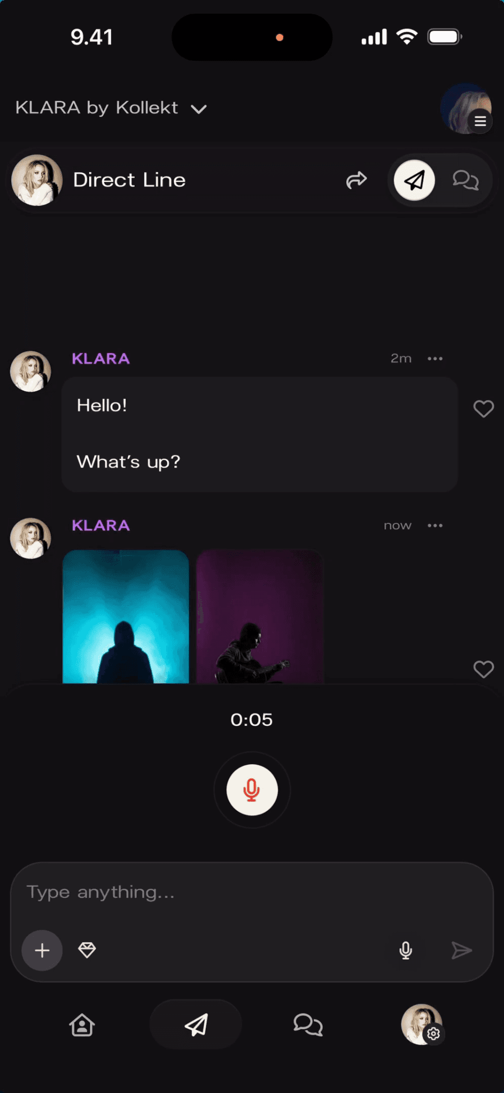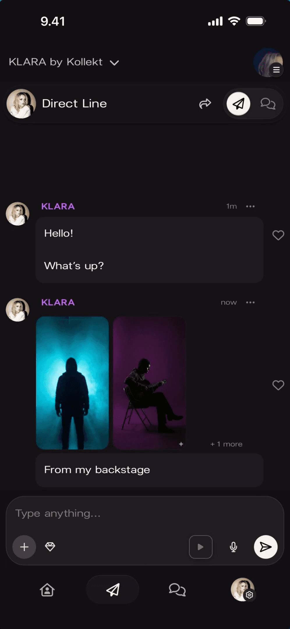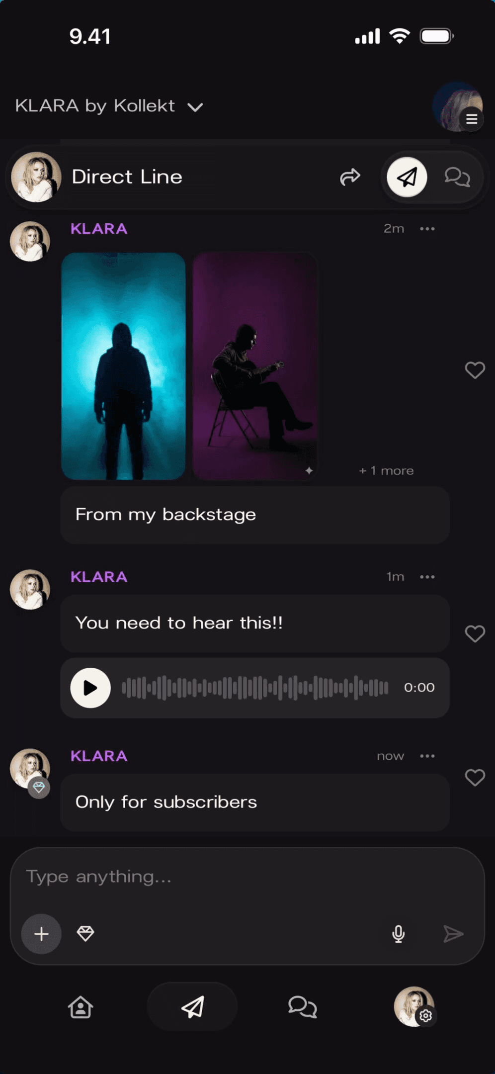 At the bottom of the screen, tap the arrow icon — that’s Direct Line. This is your one-way channel to every member of your community. Only you and your team can post here. Fans receive your messages and can react with a heart.