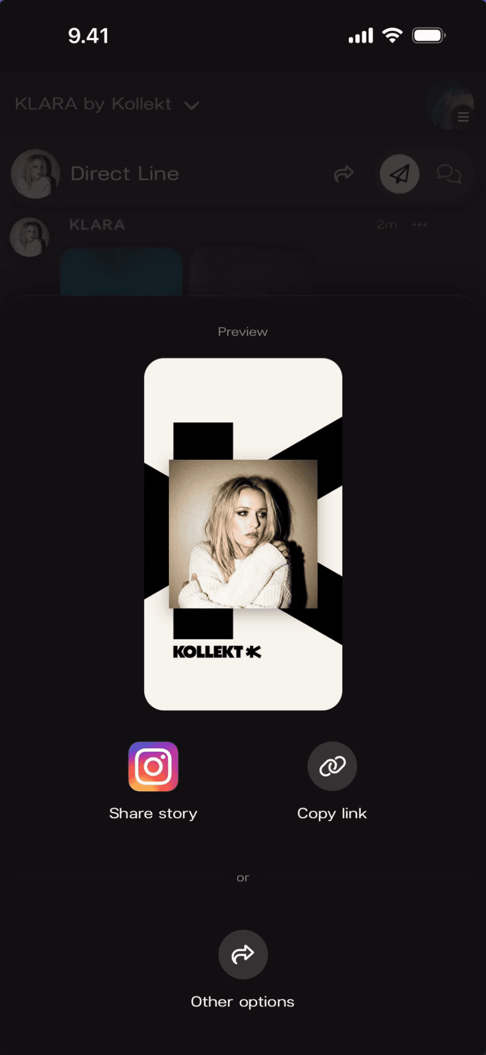 Tap the share icon at the top right of Direct Line. You’ll see a preview of your Kollekt card and three options: Share Story opens Instagram with a branded card ready to post, Copy Link copies your Direct Line URL, and Other Options opens the native share sheet.